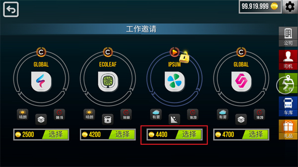 3、在正式的開啟駕駛之前,玩家還將需要接受一個(gè)對(duì)你的工作邀請(qǐng),有多個(gè)不同的公司,點(diǎn)擊你喜歡公司下方的【選擇】按鈕即可;