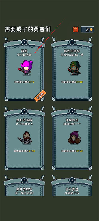 3、來到勇士角色之間的選擇,在一眾的角色中選擇一個冒險英雄,不同英雄之間的實(shí)力各有所不同,作為一個新手的小編點(diǎn)擊第一個角色體驗(yàn)一下這個玩法;