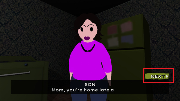 2、此時將會出現(xiàn)一個媽媽的角色,需要和這個媽媽的角色進行對話,并點擊屏幕右下角的【next】按鈕以進行對話的推進;