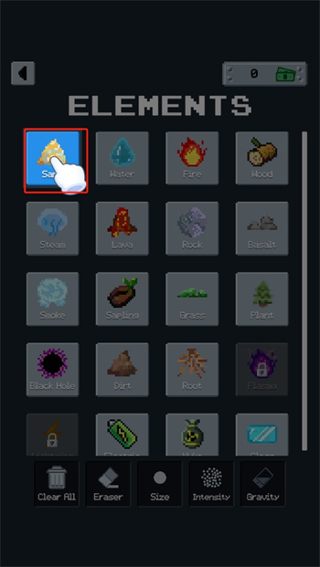 3、這里是各個(gè)創(chuàng)造世界的元素,點(diǎn)擊第一個(gè)已解鎖的沙子,在這個(gè)世界的地面之上放置上沙子,此外還有更多的天氣災(zāi)害與種子等選項(xiàng);