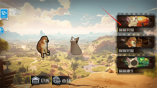 1、在屏幕之上看到這里熟悉的爆火表情包小貓貓還有小狗狗,在一片遼闊的山群繚繞的背景之下,點(diǎn)擊右邊三個(gè)戰(zhàn)斗模式中的一個(gè);