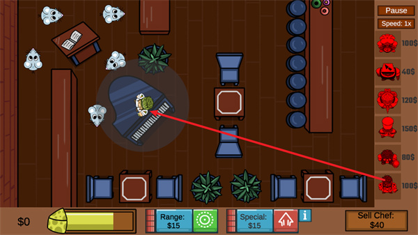 和老鼠斗智斗勇,如在老鼠必經(jīng)的位置之上添加上一些不同的攻擊裝置或是廚師角色;
