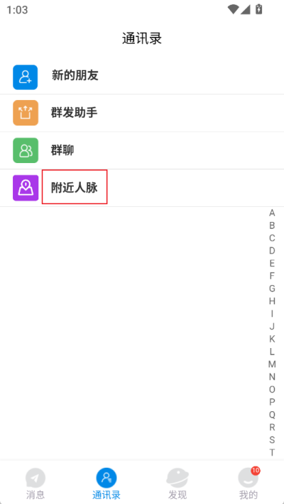 2、進(jìn)入通訊錄界面后可以查看自己的好友,找到【附近人脈】選項(xiàng)并點(diǎn)擊;