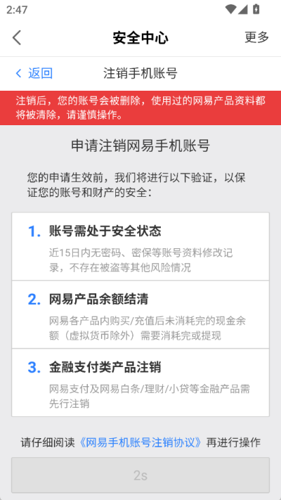 5、點(diǎn)擊后進(jìn)入注銷(xiāo)手機(jī)賬號(hào)界面,在這里仔細(xì)閱讀手機(jī)賬號(hào)注銷(xiāo)協(xié)議后,點(diǎn)擊最下方的【確認(rèn)注銷(xiāo)】即可。