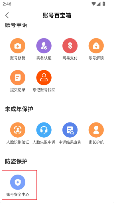 3、點(diǎn)擊后進(jìn)入賬號(hào)百寶箱功能界面,將該界面的功能下拉,找到最下方的【賬號(hào)安全中心】選項(xiàng)并點(diǎn)擊;