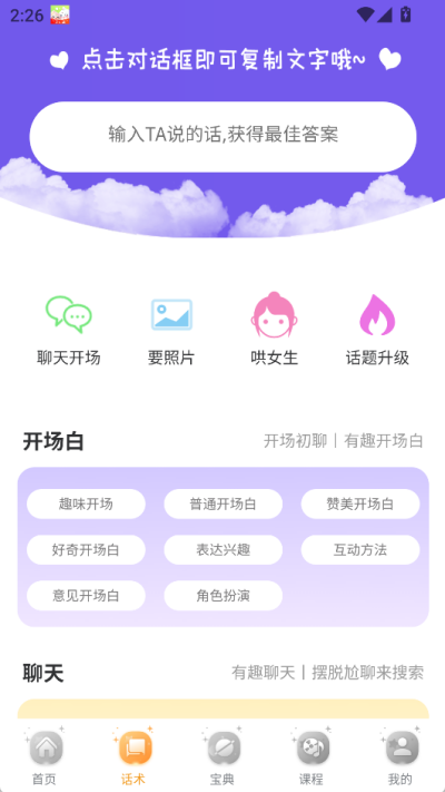 聊天開場、要照片、哄女生、話題升級等多個功能選項提供,根據(jù)自己的需求選擇對應的話術