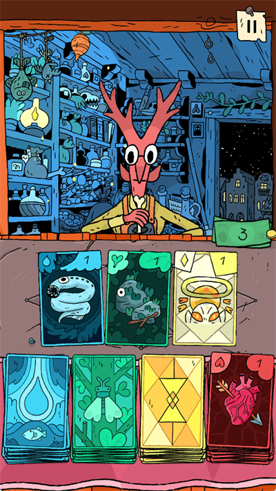 獨(dú)特的卡牌系統(tǒng)與模擬經(jīng)營玩法相結(jié)合,為玩家打造了一個充滿策略與樂趣的商業(yè)冒險體驗(yàn),適合喜歡經(jīng)營類游戲和卡牌策略的玩家,在里面可以使用四種不同顏色的卡片進(jìn)行組合,為顧客制作出不同的組合卡牌,能夠在里面制作出更多高等級的藥水。