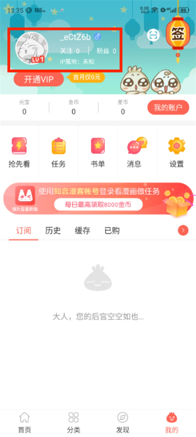 1、首先打開下載好的知音漫客app,進入軟件后點擊界面右下角【我的】選項;