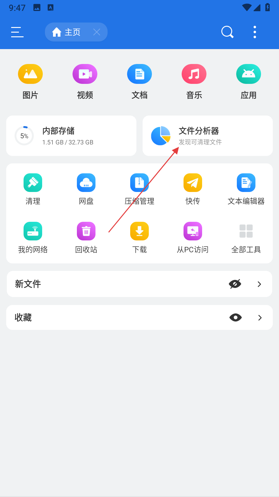 1、打開ES文件管理器app進(jìn)入主頁,在主頁界面中找到文件分析器并點(diǎn)擊,即可進(jìn)入文件分析界面。