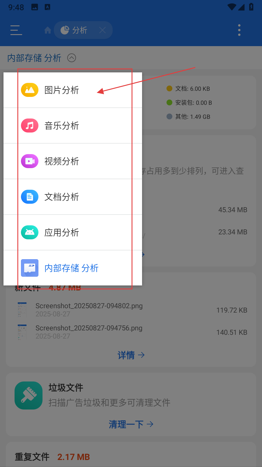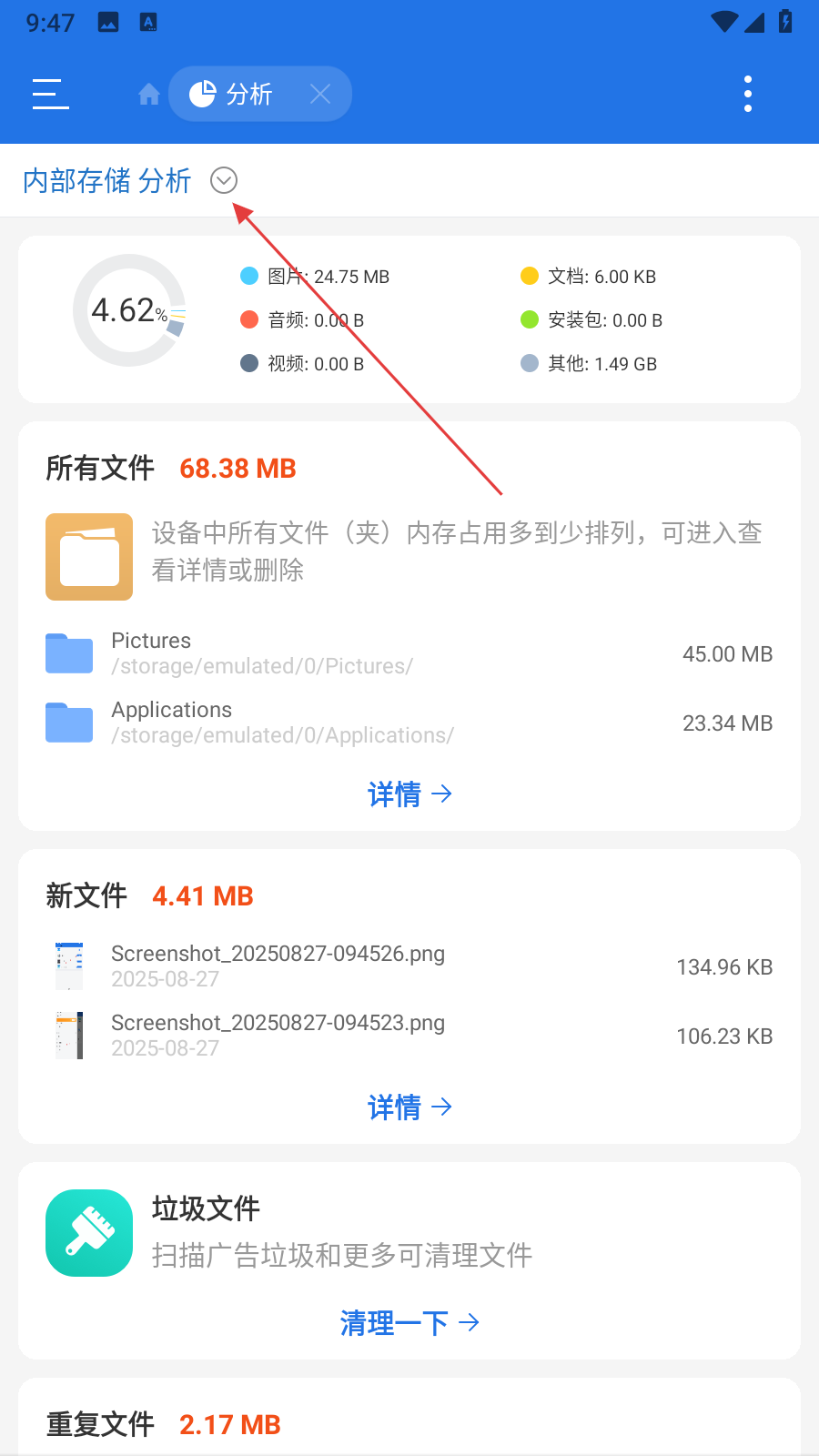 2、軟件會(huì)初步掃描并展示內(nèi)部存儲(chǔ)的文件占用情況,然后點(diǎn)擊內(nèi)部存儲(chǔ)分析右側(cè)的下拉箭頭。