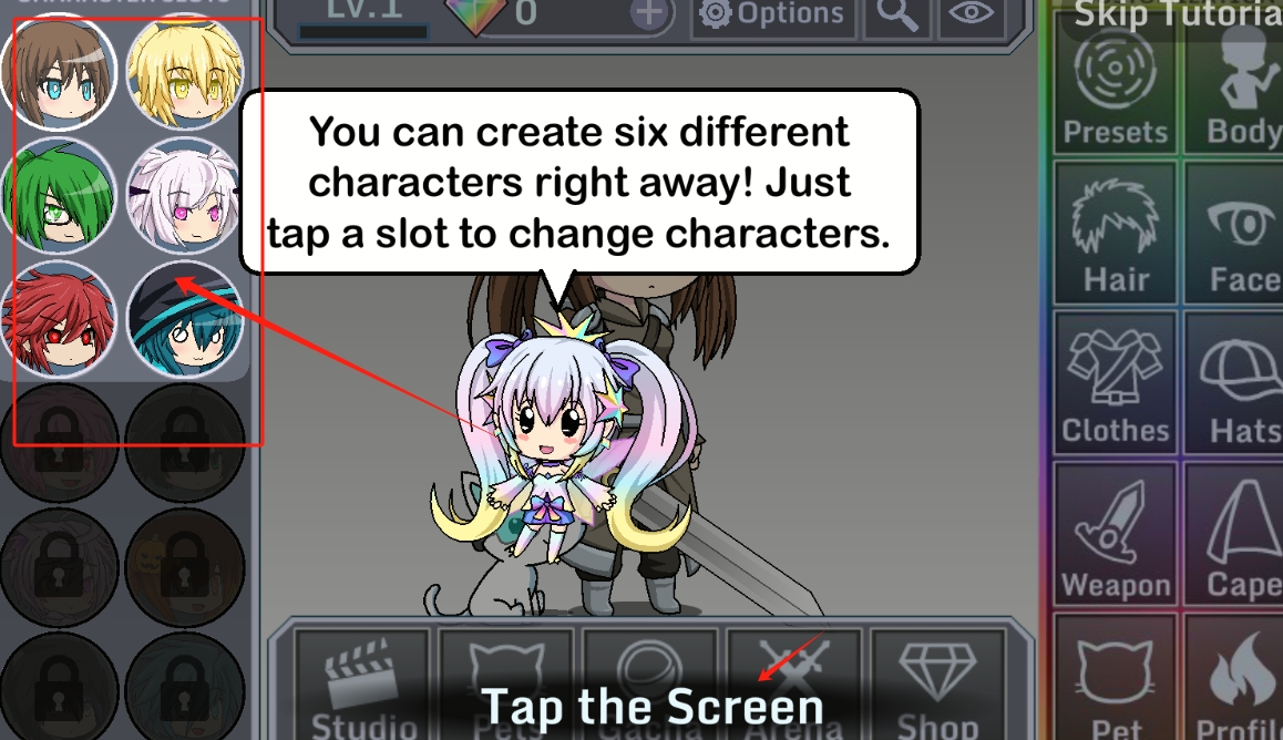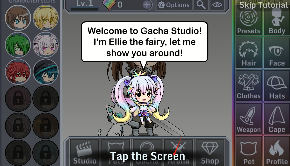 1、進(jìn)入GachaStudio游戲,點(diǎn)擊屏幕TapScreen開始,跟隨小精靈Ellie了解游戲。