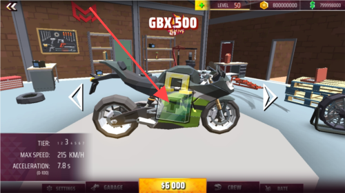 1、在車庫(kù)界面,可查看摩托車如【GBX 500】的屬性,花費(fèi)$6000購(gòu)買,為比賽或冒險(xiǎn)做準(zhǔn)備。