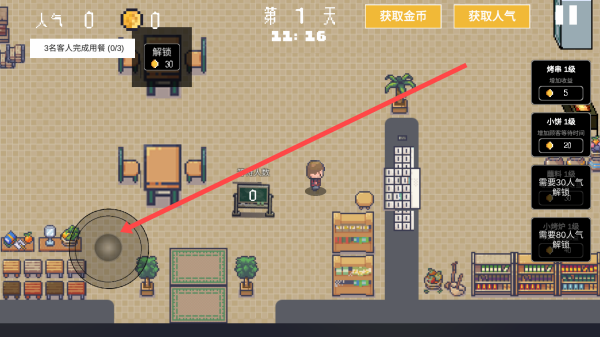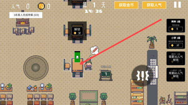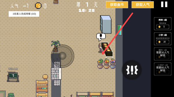2、依照箭頭指向,及時(shí)引導(dǎo)小人前往指定桌子接待客人,推動(dòng)游戲進(jìn)程發(fā)展。