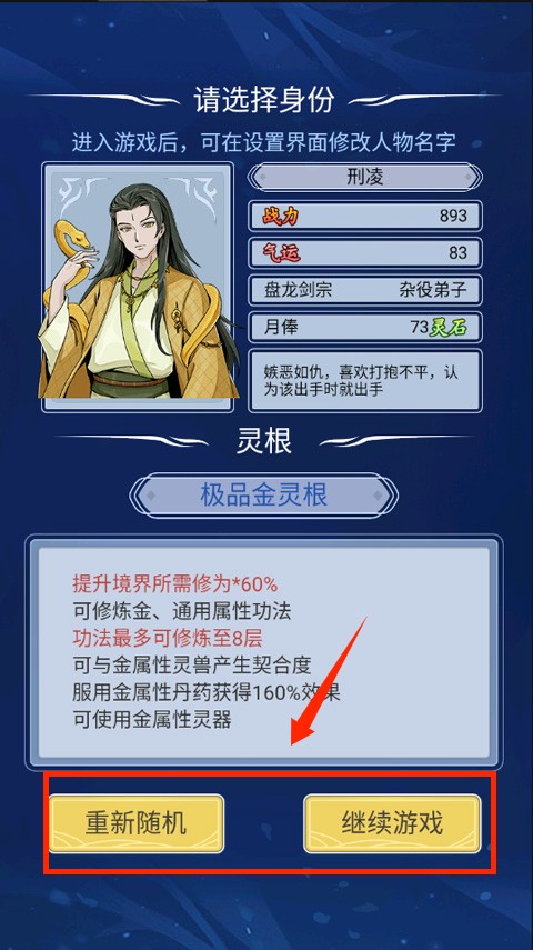 2、首先玩家就要選擇身份,靈根、戰(zhàn)力、氣運等人物數(shù)值都可以隨機選擇。