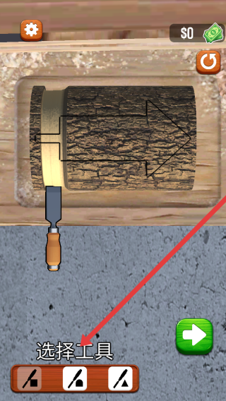 1、進(jìn)入游戲界面,根據(jù)提示【選擇工具】,從下方工具圖標(biāo)中選取合適工具開始雕刻木材。