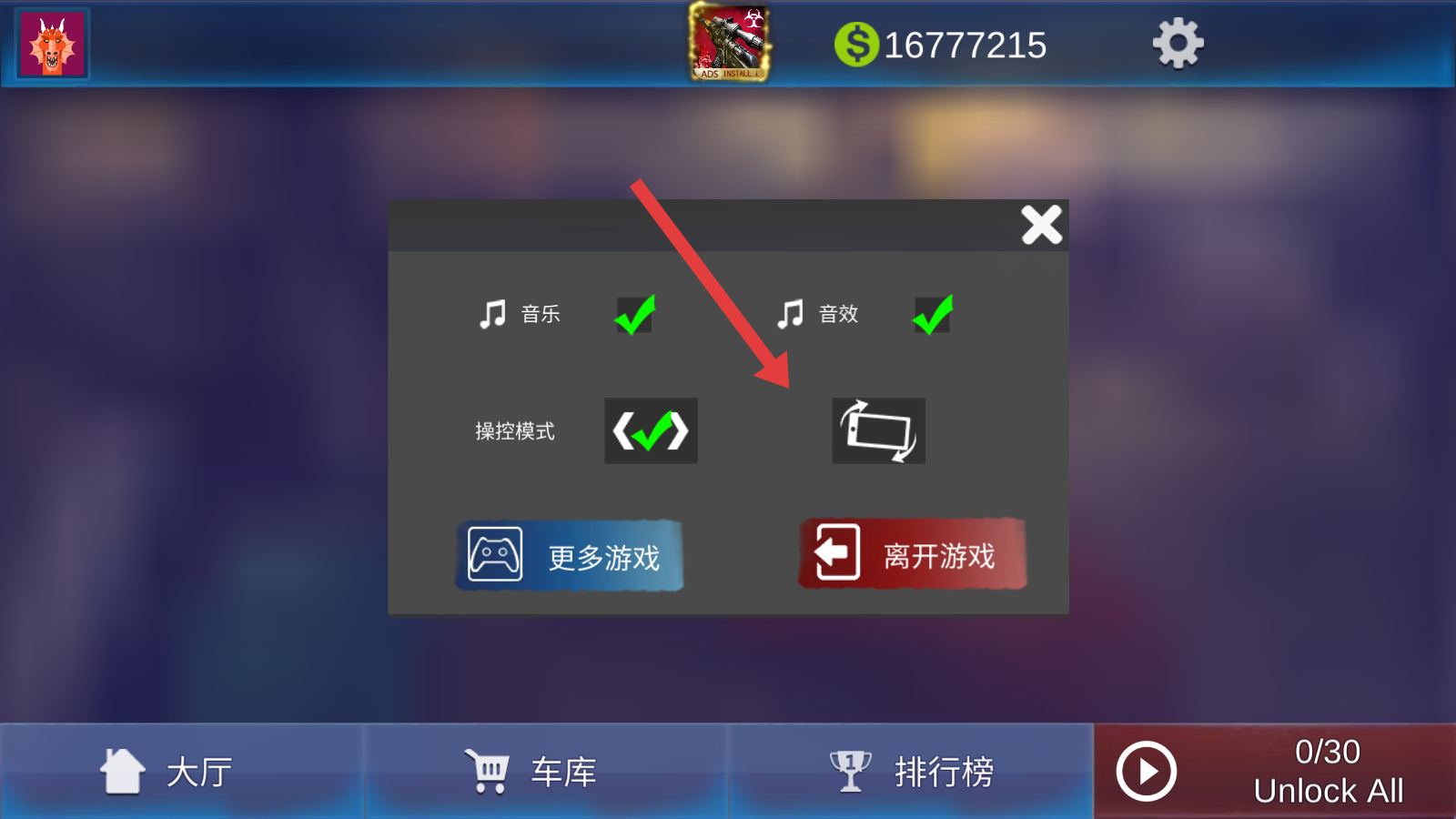 1、進入游戲后,點擊上方此輪選擇操控模式,默認(rèn)按鍵,可切換重力感應(yīng)。