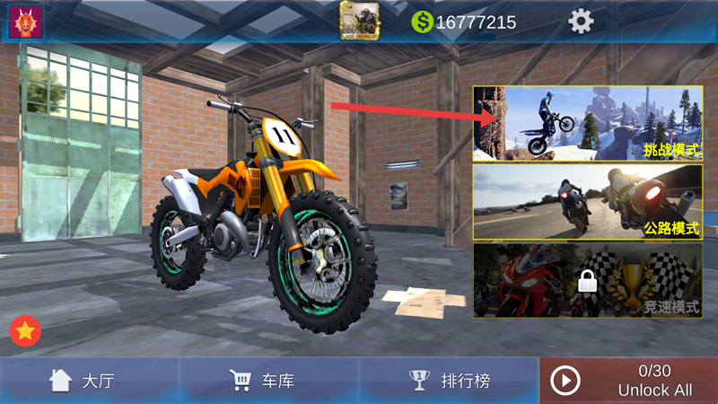 2、回到主界面,可選擇挑戰(zhàn)模式快速累積資金解鎖車庫的車輛,改裝提升性能。