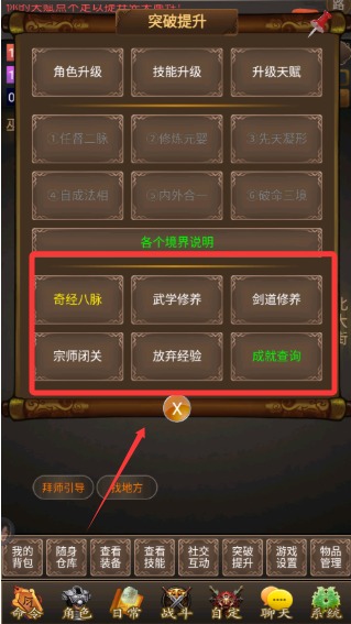1、通過(guò)游歷系統(tǒng)探索地圖、接取任務(wù),提升修為并積累經(jīng)驗(yàn)值,逐步解鎖更高級(jí)武功。