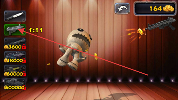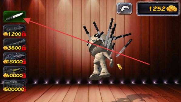 2、游戲中,可使用金幣購買道具,如花費1200金幣解鎖【刀】道具,對玩偶進行攻擊獲取金幣。