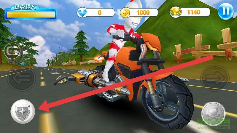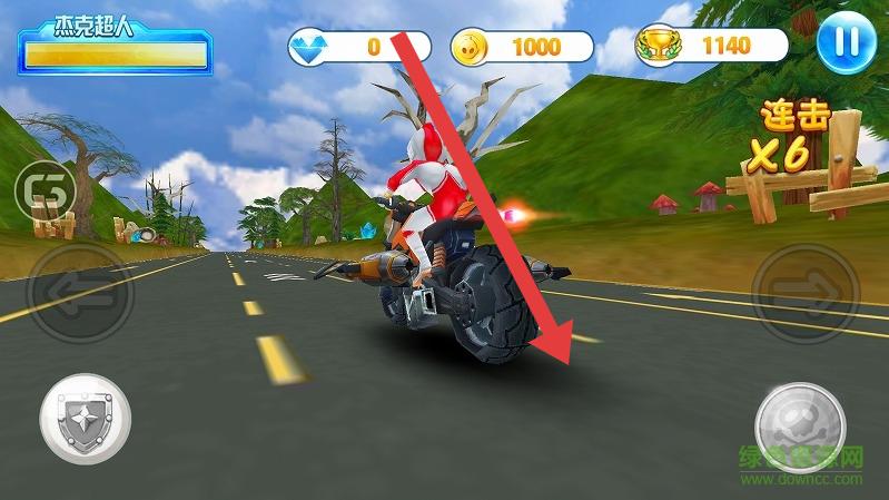 2、在騎行場(chǎng)景中(第二張圖),通過屏幕左右兩側(cè)的箭頭按鈕(如紅色箭頭指向的方向)控制摩托車行駛方向,躲避障礙物。