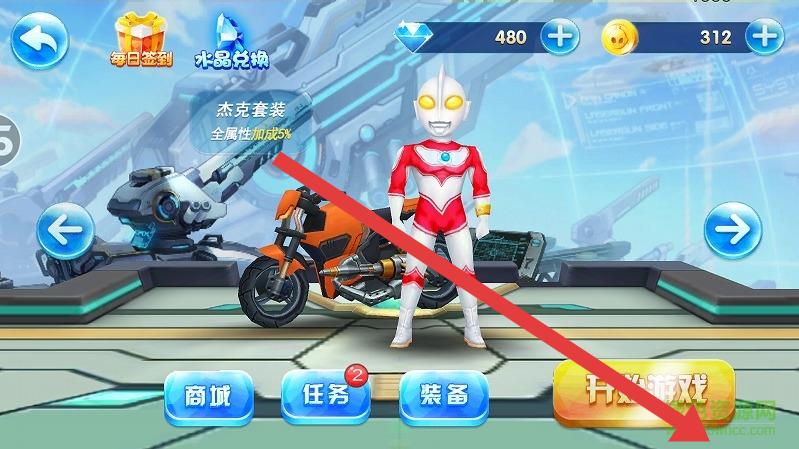 1、在游戲主界面(第一張圖),點(diǎn)擊右下角“開始游戲”按鈕(紅色箭頭指向),進(jìn)入游戲場(chǎng)景,操控角色(杰克超人)開始冒險(xiǎn)。