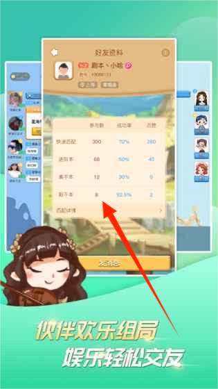 1、進(jìn)入界面查看好友資料,依據(jù)各項(xiàng)數(shù)據(jù)選擇伙伴,歡樂組局進(jìn)行互動(dòng)。