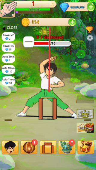 1、挑戰(zhàn)獎(jiǎng)勵(lì)與策略養(yǎng)成:每次成功劈磚可獲取金幣與能量水晶,金幣可用于購(gòu)買(mǎi)角色皮膚、升級(jí)劈磚道具,如加重手套。