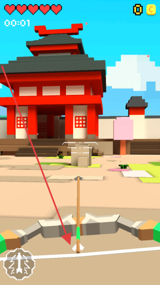 2、進入關(guān)卡后,依照箭頭方向,在規(guī)定時間(如00:01)內(nèi),拖動屏幕調(diào)整弓箭發(fā)射角度,準備射擊僵尸。