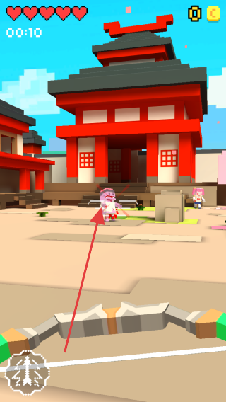 3、游戲進行中,按箭頭指引瞄準出現(xiàn)的僵尸(如粉色僵尸),發(fā)射弓箭進行攻擊,注意自身血量(如愛心標識),避免被僵尸近身。