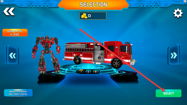 2、游戲中在選擇界面(SELECTION),依照箭頭方向點擊綠色的【SELECT】按鈕,選擇機器人消防車角色。