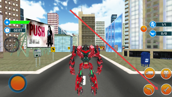 3、緊跟紅色箭頭指引,在城市街道上靈活操控機器人消防車(通過界面按鈕,如右下角的武器、變形等功能)。