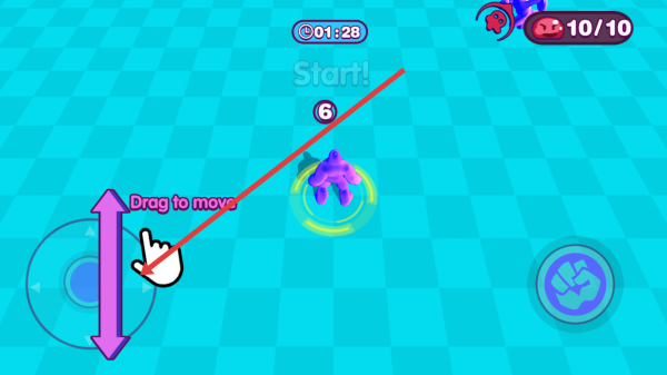 2、在游戲場(chǎng)景中(第二張圖),按照左側(cè)提示“Drag to move”,通過拖動(dòng)左下角的虛擬搖桿。