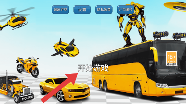 1、畫面中展示黃色可變形交通工具(警車、跑車、大巴、直升機(jī)等)與大黃蜂的機(jī)器人角色,玩家操控這些機(jī)械單位展開冒險,點(diǎn)擊【開始游戲】方可進(jìn)入。