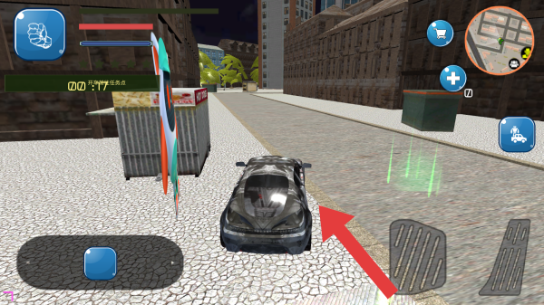 3、畫面中有一輛汽車行駛在城市街道上,界面包含駕駛控制按鈕、右上角地圖、左上角狀態(tài)條,玩家可操控車輛在城市環(huán)境中行駛,展現(xiàn)了駕駛操作與城市場景互動體驗(yàn)。