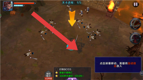3、根據屏幕提示,點擊屏幕移動角色(箭頭指向區(qū)域),英雄自動攻擊敵人,跟隨黃色箭頭指引,推進關卡進程。