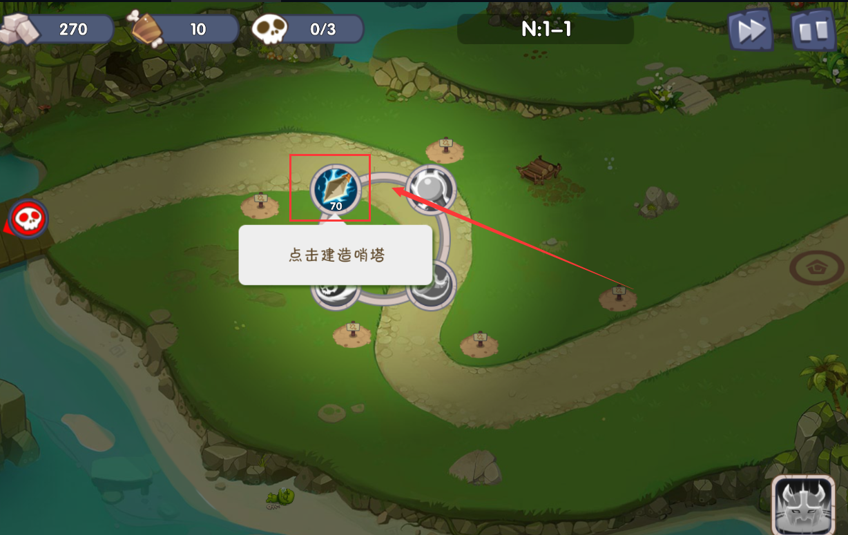 3、在地圖指定位置點(diǎn)擊建造按鈕,從可選防御設(shè)施中選擇合適類型進(jìn)行布防部署。