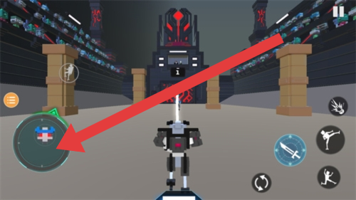 3、進(jìn)入戰(zhàn)斗界面(第三張圖,機(jī)器人對(duì)戰(zhàn)場(chǎng)景),通過(guò)左側(cè)虛擬搖桿(紅色箭頭指向,圓形控制盤(pán))。