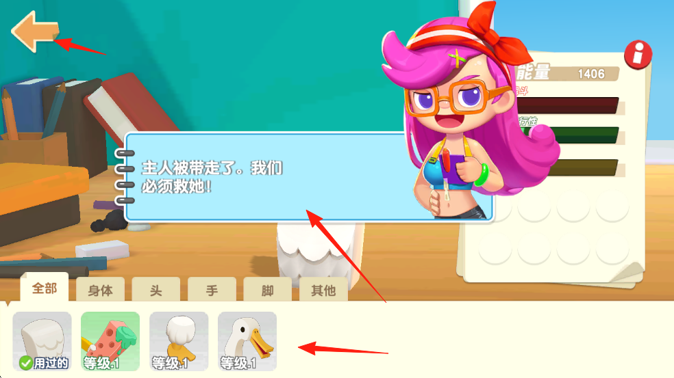 1、在初始界面了解到主人被帶走了我們必須救她!”這一劇情任務(wù),可查看角色“能量”數(shù)值,并按需選擇下方的裝備部件來強化角色。