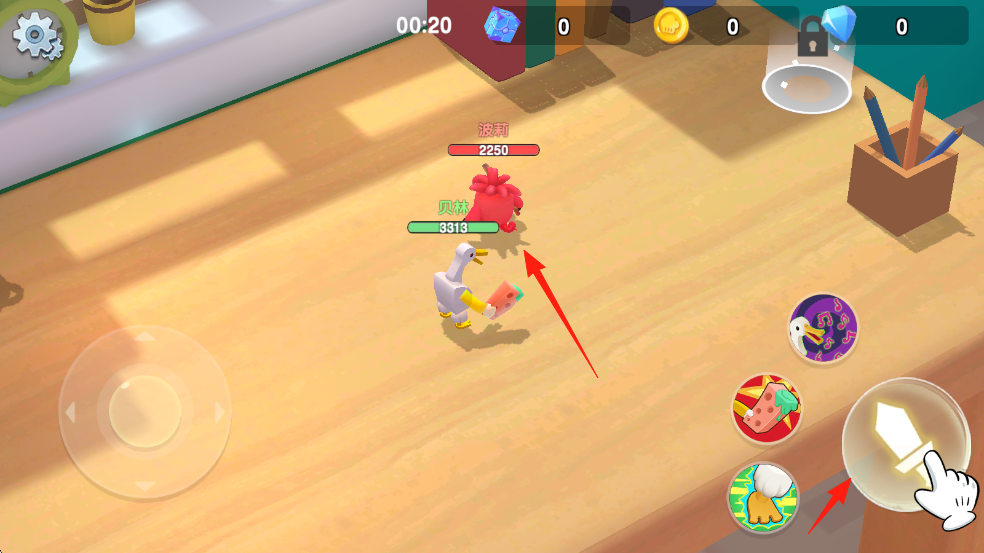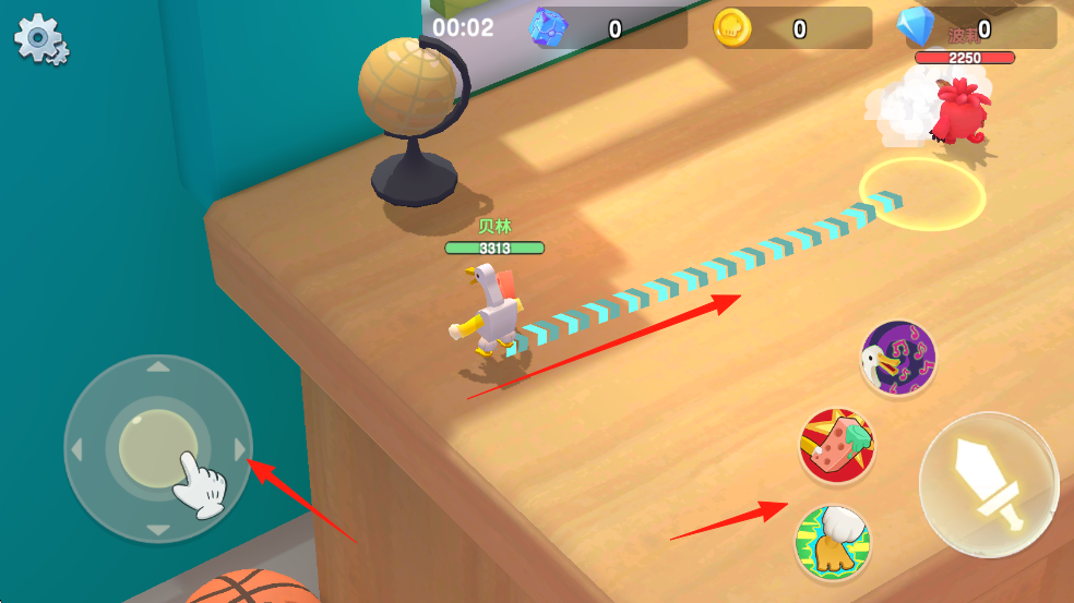 2、進入戰(zhàn)斗場景,通過左下角的虛擬搖桿控制角色移動,按照紅色箭頭指示方向前進,點擊右下角技能按鈕,對敵人發(fā)起攻擊。