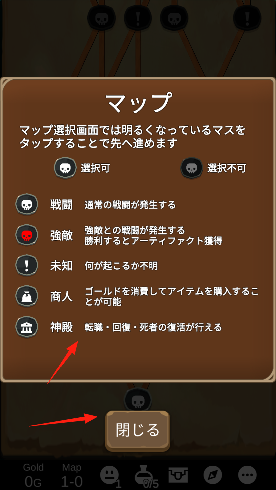 3、進(jìn)入游戲地圖界面了解不同圖標(biāo)含義,如普通戰(zhàn)斗,與強(qiáng)敵戰(zhàn)斗,勝利獲獎(jiǎng)勵(lì),按需點(diǎn)擊對(duì)應(yīng)圖標(biāo)探索,操作完畢點(diǎn)擊關(guān)閉地圖界面。