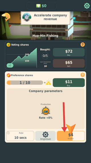 3、點擊【$4】按鈕,加速公司收益,提升游戲中的經(jīng)濟(jì)收益。