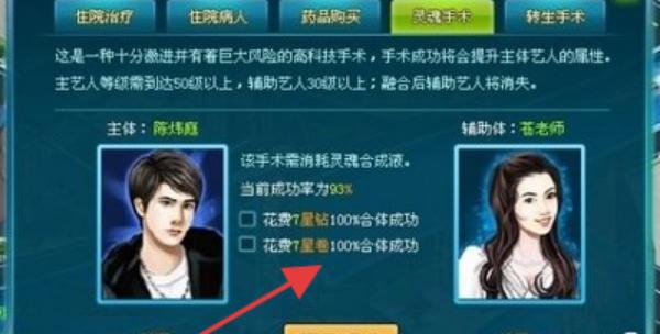 2、在“靈魂手術”界面,若滿足條件,勾選提升成功率選項,點擊確認進行手術操作,提升主體藝人屬性。