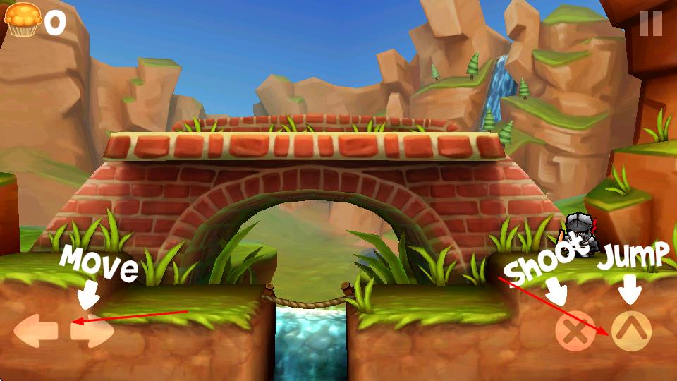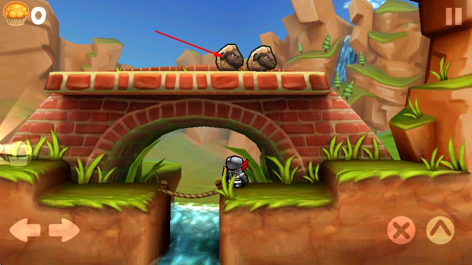 2、在關(guān)卡中,點(diǎn)擊跳躍鍵跨越溪流、繩索,遇到小羊敵人時(shí),按射擊鍵攻擊;利用場景掩體(如石橋)躲避傷害,推進(jìn)關(guān)卡。