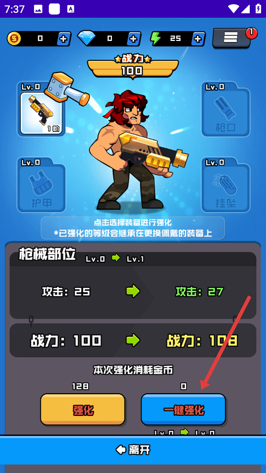 2、獲取金幣進(jìn)入裝備欄升級(jí)各項(xiàng)數(shù)值,否則只能被敵人攆著走。
