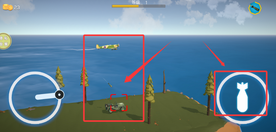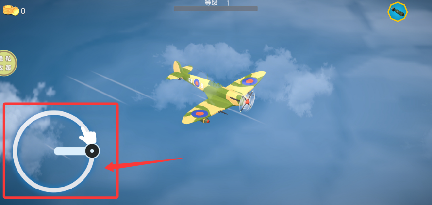1、進(jìn)入游戲,通過左下角虛擬搖桿操控戰(zhàn)機(jī)飛行,體驗真實空中格斗。