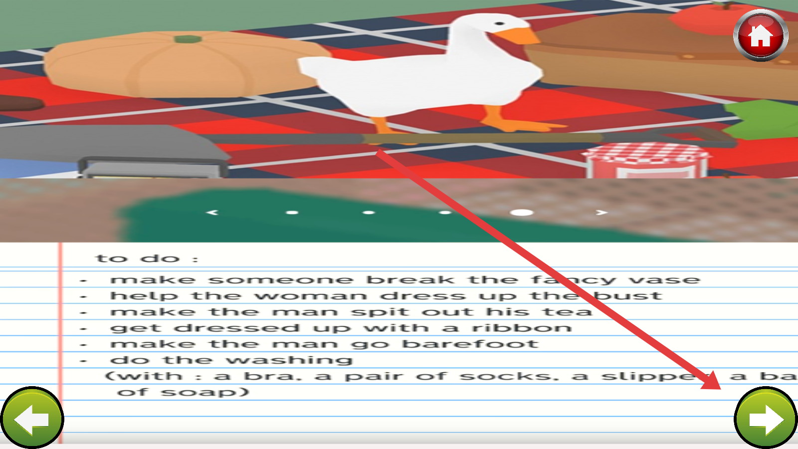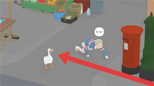 3、在游玩場景中,按箭頭指示,操控大白鵝靠近目標人物,利用場景中的道具和互動機制,完成相應(yīng)任務(wù),推動游玩進程。