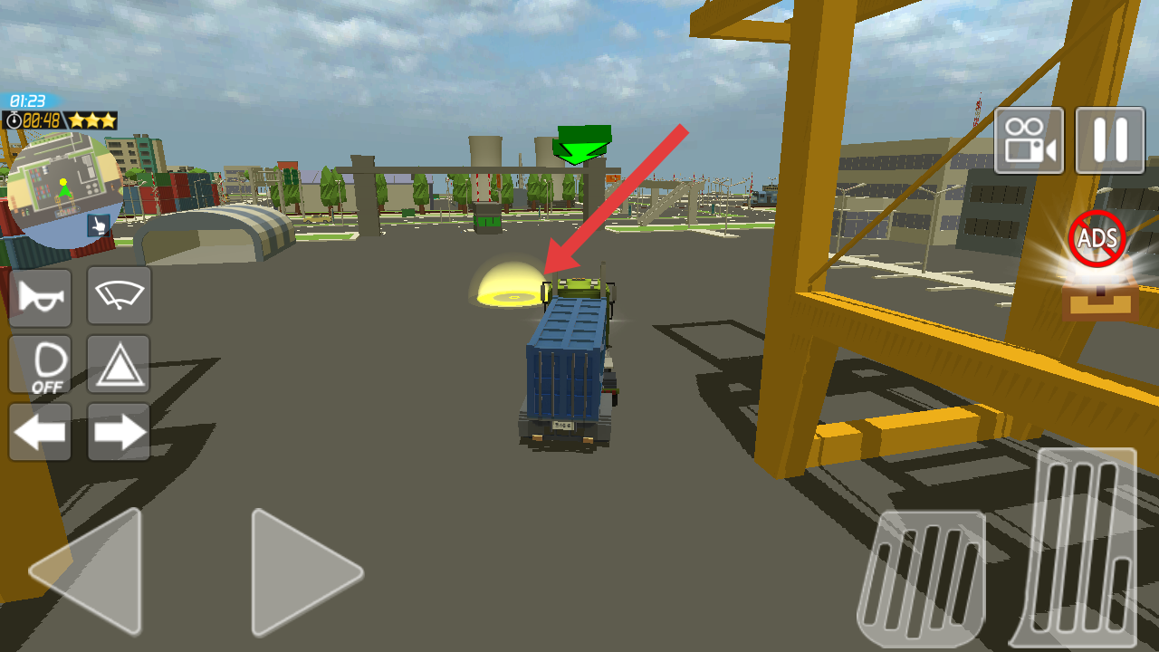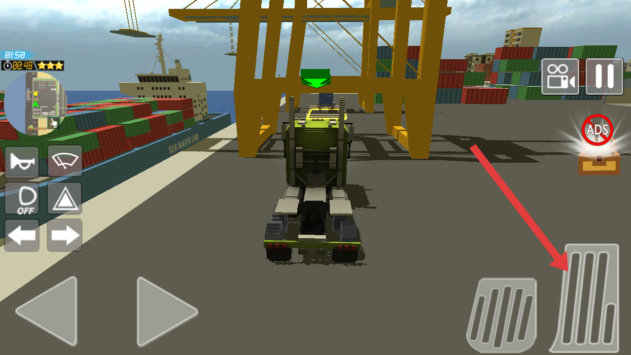 2、在駕駛過程中,操作右側(cè)油門踏板(紅色箭頭指向),控制卡車前進(jìn),注意場景中的集裝箱和港口環(huán)境。