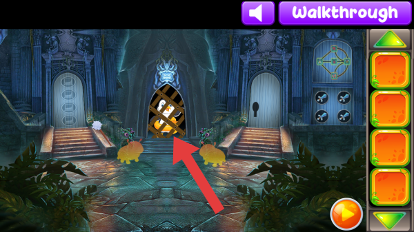 2、畫面呈現(xiàn)神秘城堡場(chǎng)景,中間有被囚禁的角色,左右有裝飾門,還有植物、黃色小生物,箭頭指向被囚禁處,引導(dǎo)玩家解救該角色,屬于逃脫解謎環(huán)節(jié)。