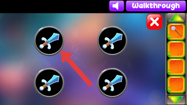 3、畫面顯示四個(gè)帶劍圖案的圓形按鈕,右上角有攻略指引和關(guān)閉按鈕,右側(cè)是道具欄(含錘子道具等),是游戲中觸發(fā)機(jī)關(guān)、解謎的交互環(huán)節(jié)。