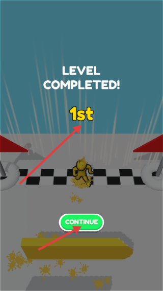 3、關(guān)卡完成界面,顯示“LEVELCOMPLETED!(關(guān)卡完成)”,排名“1st(第1名)”,可點(diǎn)擊“CONTINUE(繼續(xù))”進(jìn)入下一關(guān)。